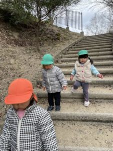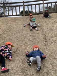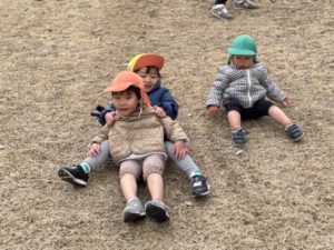 南部丘陵公園の芝生広場に芝滑りにいきました。保育士がお散歩リュックや芝滑りに使う段ボールの板などを用意していると、「おさんぽいくの?」「しばすべり?」「いきたーい!いくいく!」と大盛り上がり。お友だちが登園してくると「しばすべりいくよー」「いっしょにすべろうよ~」と誘う様子がありました。しかし、お友だちが少し弱気になってしまったのか「しっぱいしちゃうよぉ~」と言うと「わたしの背中もってすべる?」と優しい会話も聞かれました。とにかくわくわくした気持ちが伝わる一場面でした。