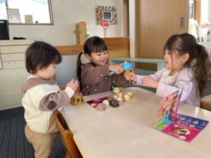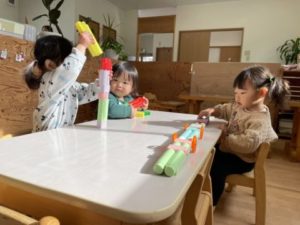 登園してくると、「このおもちゃであそびたい!」というリクエストがありました。その玩具はアイスクリームのおもちゃでした。カゴから出して「どれがいい?」「これがいいです。」とお店の人とお客さん役に分かれてアイスクリーム屋さんの開店です。お友だちから注文が入ると、「ちょっとまててくださいね。」「はい。どうぞ。」とコーンにアイスをのせて渡してくれる姿は、本物のアイスクリーム屋さんさながらの動きでした。という遊びが繰り広げられる中、別のお友だちが「もしもし。アイスクリームです」と大きなアイスクリームのメニュー表を耳にあてお電話中です。電話に見立てられる物が近くになっかたためか、メニュー表を電話かわりに・・・。メニュー表を耳と肩に挟んでスマートフォンにする姿が少し大変そうだなぁと思い、もう少し本物に近いスマートフォンに見立てられる物はないかと考え、かまぼこの板だったらどうなるだろう?とそっとかまぼこの板を準備してみました。板が置いてあることにすぐ気が付き、早速、使う姿がありました。人差し指をとシュッとすべらし形も大きさもジャストサイズなようでした。片手で電話を持てるようになったアイスクリーム屋さんは大忙しになりました。電話でたくさんの注文を受け配達にも出かけます。子どもたちの遊びを見ていて今時だなぁと時代を感じされられる事もしばしばあります。子どもたちの観察力ってホント面白いですよね。別の場所では、ブロック遊びを楽しむお友だちの姿がありました。高く積み上げてみたり、長く電車のように作って遊んでみたり、大きな不思議な眼鏡を作って「よ~くみえますよ」とそれぞれに遊びを楽しむお友だちの姿もありました。
