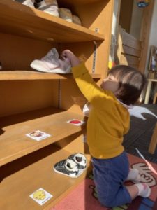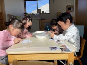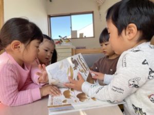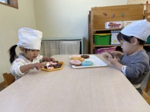 ドーナツの玩具を並べたり、トレーの上に1つずつ丁寧に置いる子どもたちの姿があり、その様子からフェルトで出来たドーナツや和帽子、トング、ドーナツのメニュー表などを用意してみる事に。すると・・・直ぐにそれらのアイテムを見つけさっそく遊び始めました。和帽子を自分で一生懸命被ろうとしています。和帽子を身に付け、更にエプロンも。その姿はまるで本物のドーナツ屋さん。トレーの上にフェルトのドーナツを数個乗せ忙しそうに行ったり、来たり。とっても可愛らしい姿でした。傍にいたお友だちも和帽子を被り何やら相談中。見ていて「次の新作ドーナツはどうする?」なんて会話が聞こえてきそうな様子でした。別の机では前日に引き続き動物図鑑を見て盛り上がっています。動物図鑑には図鑑と言うだけあり、沢山の動物が載っているのですが・・・子どもたちが気になるのはコウモリ。「コウモリはむらさきいろだよ」「ちがう、くろだよ」と、討論会が始まったようです。子どもたちから色に関する話題が聞こえてきました。そこへコウモリのイラスト置いてみると・・・「くろがいい、こうもり」「ぴんくにする?」と。色鉛筆を数本用意。そこから子どもたちは色ぬりに夢中になっていました。塗り終えると「はさみちょうだーい」と、次々展開。何故か?コウモリに夢中なのです。コウモリへの情熱は今後どの様になっていくのでしょうか?今後の動向が楽しみですね。