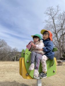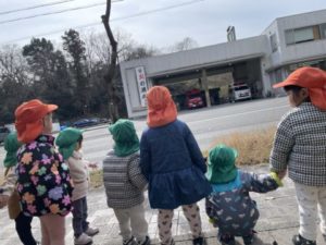救急車や消防車のサイレンが聞こえてくると子どもたちは玩具で遊んでいても手を止め、サイレンが聞こえて来る方へと移動し、通り過ぎるのを今か今かと待ちわびています。目の前を通り過ぎると何故か?みんなでピョンピョンとジャンプをし「きゅうきゅうしゃー!!」と、喜びが溢れています。この様な子どもたちの姿から救急車や消防車のイラストをラミネートした物を用意。すると・・・そのイラストを手に「ピーポー、ピーポー」「ウーウーウー」っと言いながら机の上を走らせていました。どんな玩具よりも子どもたちに救急車や消防車の方が魅力的な様です。それならば!!と、本物の消防車や救急車を見に出掛ける事にしました。さぁ、出発!歩き進めていくとガサガサ・・・ガサガサ・・・と音が聞こえて来ます。子どもたちはそれを「コウモリじゃない?」「コウモリだよ!」と。ガサガサ・・・と言う音の正体は・・・カラス。しかし、子どもたちの中ではもうコウモリ。見てみたかったコウモリ。本当はカラスなのですが・・・視線を逸らすことなく飛んで行ってしまうまで釘付けでした。更に歩き進め本物の消防車や救急車が見えてきました。しかし・・・いつも止まっている消防車がいません。子どもたちは「しょうぼうしゃ、2つもいない」「おうちが、かじになっちゃったからいないんだよ」「かじになったらしょうぼうしゃがくるから」などと2歳児の子どもたちは話していました。消防車や救急車を見た後は更に歩き進め、公園内へ。「いっしょにのろうよ!」と小さいお友だちを誘ってユラユラ揺れる遊具へ一緒に乗車。一人で乗るのが難しくても傍にいたお友だちが乗るお手伝いをしてくれています。子どもたちの優しさにじんわり心が温かくなりました。