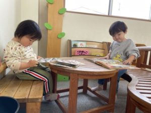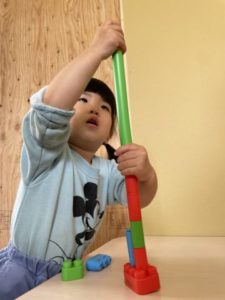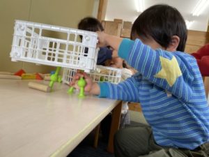 前日とは違う玩具を用意し、棚に置いておくと・・・園庭からお部屋に帰ってきた子どもたちが玩具を見つけ「わぁ~!!」っと大喜び。玩具の入ったカゴを机の上に運んできて遊び始めています。子どもたちが手にした玩具は積み木と吸盤の玩具。積み木の入ったカゴから積み木を出し、空になったカゴの下に吸盤を幾つかくっつけ、何だか面白い展開。カゴの中に積み木を入れ「おにく、やいてるの~」「もうちょっとまっててね」と、数日前の焼肉と同じ様な展開に。暫く遊んで違う玩具に交換しようとしている姿があり「いまだ!」と、ソフトブロックを用意してみました。すると・・・そこから先日の焼肉の展開になっていくのかと思いきや・・・違ったのです。ソフトブロックのパーツを幾つか繋げ近未来的な街のような物が出来上がっていきます。「ここにつけてみたらいいんじゃない?」「こっちにつけてみる!」2歳児の子どもたちは相談しながら1つの大作を作り上げていました。前日のお手紙をポストへ投函しに行った経験から、玩具のカゴの取っ手部分から、たいらな積み木を入れ「おてがみいれてるんだよ」なんて教えてくれた子もいました。経験した事を取り入れ、遊びに展開させていく子どもたちの発想力には脱帽です。