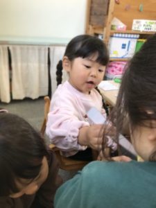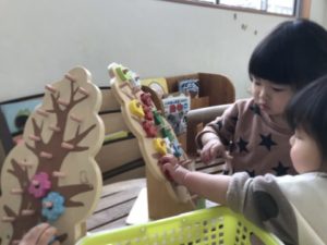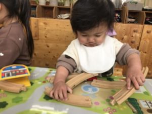 「つぎのかんじゃさん、どうぞ~」とお医者さんになりきったお友だちが患者さんの呼び始めました。お医者さんの所にお友だちがやってくると、お熱を測る仕草や注射を打つ仕草をして診察が始まりました。遊びがもう少し展開できればいいなと思い、ラミネートしたお医者さのアイテムをそっと用意してみると、患者さんが「おねつがおるの~」とやってきました。体温計で熱を測り「お熱です!お薬どうぞ」というやり取りが見られたり、お医者さんになりきったお友だちの診察はまだ終わらない様子。続いての患者さんは怪我をしているようです。足をじっと見て「ほねがおれてます!」と診断。おッ!骨折の診断は珍しい。どうなっていくのかなぁと見ていると、治すもの・・・一生懸命考える姿がありました。ひらめいた!治す物で子どもたちが連想したものは、なんとなんと近くにあった玩具のブロックで作ったトンカチ!まさかの治すと直す違い。思わづ吹き出して笑ってしまうほど可愛らしい姿でした。トンカチを手にお友だちの足に優しく触れ「これでなおりました!」優しい言葉掛けですね。患者さんも治ったようでニッコリ笑顔になっていました。ホッコリするヒトコマでした。別の場所ではミニカーと線路で遊ぶお友だちがいました。線路を長くつなげてミニカーを走らせて楽しそうに遊ぶお友だちの姿を見て、「やってみたい!」と思った小さなお友だちがいました。線路の端と端のつなぎ目部分をはめようと角度を変えながら試行錯誤。今回はうまく繋げる事は出来ませんでしたが、周りの様子をよく見ているんだなぁと感心させられました。