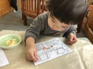 丸の形に合わせてペタッ、ペタッ!いっっぱい貼れると「でっきたー!」と嬉しそうでした。