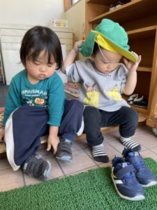 自分で靴を履いて、帽子も被って、準備OK!!