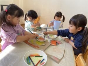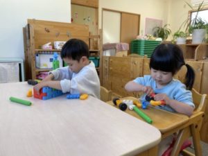 子どもたちから「おえかきしたい!」とリクエストが。準備していると・・・「かみほしい!」「大きいおりがみちょうだい!」などと2歳児の子どもたちが伝えに来ました。子どもたちからリクエストのあった物をトレーの中に入れ、机の上に置いておくと、子どもたちは使いたいアイテムを手に取り遊びを展開させていきます。折り紙を折り、シールで端を止め「おてがみできた!」と、別の子は折り紙に載っていた絵柄をハサミで器用に切り抜き「いらっしゃいませ~、どれがいいですか?」とお店屋さんのようにする子と同じアイテムでもみんな違った遊びで見ていてとても面白いなぁ~っと。折り紙に描かれていたイラストの色に興味を示した子の姿がありました。「これ、ぴんくね」「これは、あかよ」などと指差ししながら友だちと話している姿から、色にのカードを用意すると「ぴんくがいちばんすき!」「○○はオレンジがいいの」などと沢山の色の名前が聞こえてきました。今日は折り紙や色に興味が広がった1日でした。明日はどの様な事に興味を示すのか?とても楽しみです。
