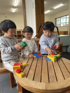 「ちょっとおそといってくる!!」と、子どもたちは元気に出掛けていきます。園庭の遊具を楽しむ子やお友だちと「まて~」っと追いかけっこをして遊ぶ子と遊びも様々。楽しそうな声が聞こえてくると「一緒にやる~!!」っと参加し、追いかけっこをみんなで楽しんでいました。お部屋に帰ってきた子どもたちは好きな玩具を手にじっくりと遊び込んでいました。すると・・・1人の2歳児が「おえかきしたいの」「かみとかきかきかして」と、伝えにやって来ました。子どもたちからリクエストのあった物を用意し、トレーの中に入れ、棚へ並べていると・・・それを見つけ「やったー!!!」「おえかきやる~」っと。好きなアイテムを選んで遊び始め、幾つかのアイテムを組み合わせ遊びが展開していきます。折り紙を手に取った子が「ハサミちょうだい!」と。ハサミ用意すると器用に折り紙に描かれているイラストを切り抜き「はい、どうぞ!」と、友だちに渡していました。折り紙に載っているイラストを見せ「どれがいい?」と尋ね「これ、これがいい!」と伝えると、そのイラストを切り抜き「きれたよ」と。すると「これもほしいの」と、お友だちが言うのです。「そっかー、わかった!ちょっとまっててね」と、素敵なやり取りでした。ケンカが起こることなく、穏やかに言葉で伝え合う姿に何だかこちらがジーンとし、この様な姿に大きくなったなぁ~っと感慨深くなりました。