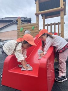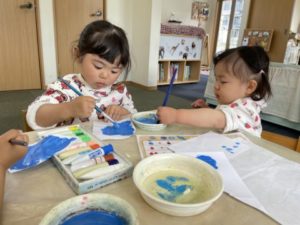 園庭へ出ると自分たちで好きな色のお花を植えた事を思い出し「○○はね~ピンクのおはなうえたの」「わたしはぶらさき(紫)のおはな」と、自分が植えたお花の色を友だちに伝える姿がありました。植えたお花の色だけでなく様々な色の名前が聞こえてきます。子どもたちのこの様な姿から色に関するアイテムを今日は用意してみました。「あおがいい」「「ぴんくちょうだい」欲しい色をリクエスト。子どもたちから聞こえてきた色を用意すると「これとこれ、まぜてみる!」と言いながら色の調合が始まりました。色同士を混ぜ合わせ、色の変化に子どもたちは驚いた様子。色が変わっていくのが面白かったようで、机の上にあった色、全て混ぜ合わせ楽しんでいました。小さいお友だちも色のアイテムに興味津々。大きいお友だちに混ざって色塗り。大きいお友だちがしているのをじーっと観察し、同じ様に真似ていました。
