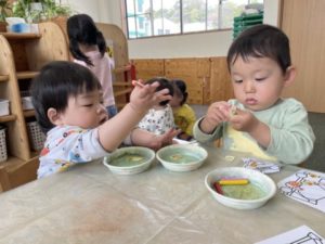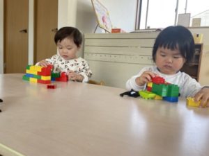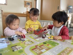 登園後、園庭で遊んでいると「ピーポーピーポー」と遠くから音が聞こえてきました。そのわずかな音を子どもたちは聞き逃しません。「きゅうきゅうしゃくるー!」と言いフェンスに並んで救急車を見送ります。そこから「はたらくくるま」の歌を口ずさむ姿が見られました。そんな子どもたちの様子から室内の机の上に車のおもちゃを準備してみました。園庭から帰ってきた子どもたちが一目散に車のおもちゃのところへ…「これ、きゅうきゅうしゃ!」「これはパトカー!」と車の名前を教えてくれます。後から来たお友だちに「どーぞ」とおもちゃを渡してあげる優しい姿がたくさん見られました。別の机には、こんな物を用意してみたら子どもたちはどんな反応を見せてくれるかなぁと思い、車の絵を描いた大きな紙を用意してみました。すると・・・あっという間に席が埋まり、「ぬりぬりする」「シールペタペタしたい!」という声が聞こえてきました。朝は泣いていたお友だちも、シールを見つけると真剣な様子でシールを土台から剥がしペタペタ貼っていくことを楽しんでいました。お兄さんの姿を見た1歳児のお友だちも興味深々な様子!シールやクーピーを手に取り見よう見まねで挑戦する姿が見られました。新しいお友だちも、日に日に好きな遊びを見つけられているようです。明日はどんな姿が見られるのか、とても楽しみです。
