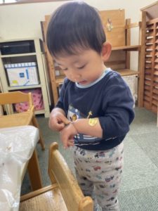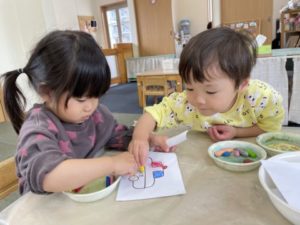 新入園児の子どもたちもお家の方との別れ際はまだまだ泣いていますが、在園児のお友だちが遊んでいる様子をじーっと観察し、興味を示した玩具を手に取り一緒に遊び始めています。玩具で遊んでいると・・・救急車のサイレンが聞こえてきました。救急車のサイレンが聞こえて来ると在園児の子どもたちは急いで道路が見渡せる場所へ行き、通り過ぎるのをいまか、いまかと待っているのです。園舎横を通り過ぎていくと「きゅうきゅうしゃーー!!」っと大喜び。その姿に新入園児の子どもたちも傍へ行き、一緒に見ようとしたのですが・・・残念ながら間に合わず。この様な子どもたちの姿から救急車や消防車のイラストや写真カード等を用意してみました。そこへシールも用意し置いてみると「ぺったんするーー!」っと、子どもたちがやって来ました。在園児の子どもたちがシール貼りをし始めると、興味を示し新入園児のお友だちもシールに手を伸ばし台紙からシールを剝がそうと一生懸命でした。貼ったシールを紙から剝がし、自分の腕に貼り「ついた!」と、沢山貼ってとっても楽しそうでした。園庭へ行こうと自分で靴を履こうと頑張る新入園児の姿も見られました。子どもたちが自分でやってみようとする姿をゆったりと見守っていきたいと思います。
