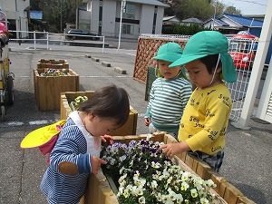 園のプランターに咲いているパンジーを見ながら、「きれいやな。」「OO,このいろすきなん」とお話していましたよ。