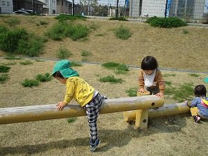 登園してくると、好きな遊びを見つけて楽しむお友だちの姿がたくさん見られるようになってきました。お部屋では、アイスクリームの玩具に夢中になったり、好きな絵本を棚から持ってきてお友だちと一緒に眺めたりして楽しんでいましたよ。風もなく暖かいお天気になったので、皆で近くの公園に散歩に出掛けました。道端に黄色い花が咲いているのに気付いて「たんぽぽや」と足を止めて観察しているお友だちがいましたよ。公園では、平均台に夢中のお友だち。平均台にまたがって前に進んだり、潜ったりして楽しんでいましたよ。